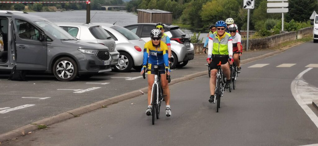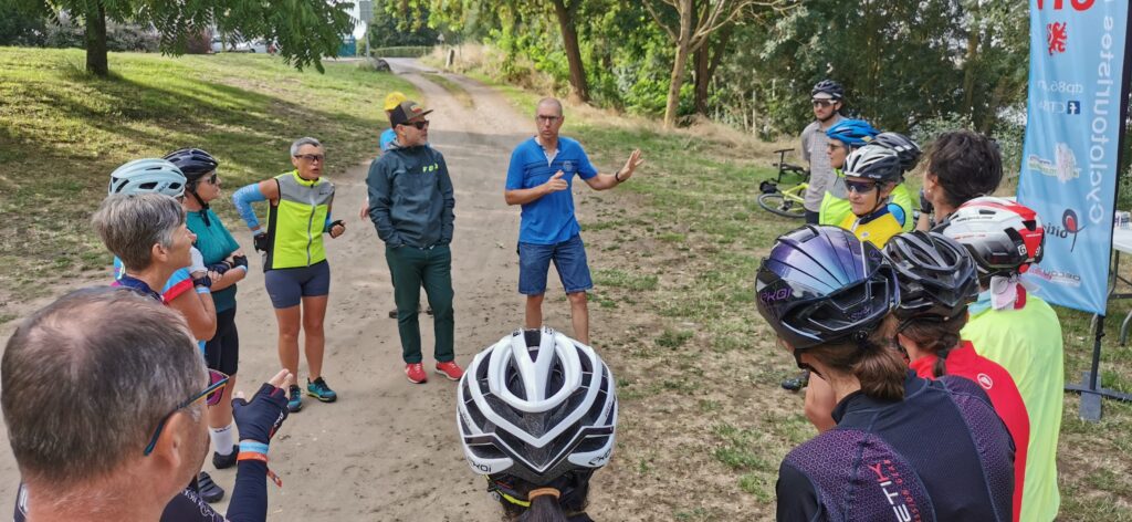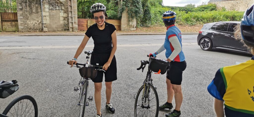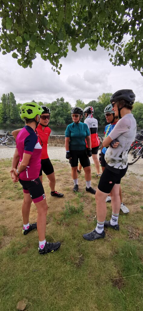 Dès 8h à Saumur, les cyclistes arrivent et se retrouvent autour d’un café, on fait connaissance, ça papote dans la bonne humeur ; les hommes sont aux petits soins, c’est très agréable, et ça sera ainsi toute la journée.